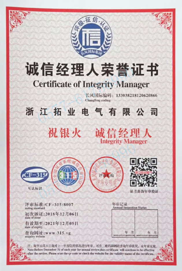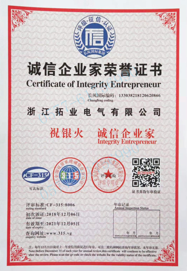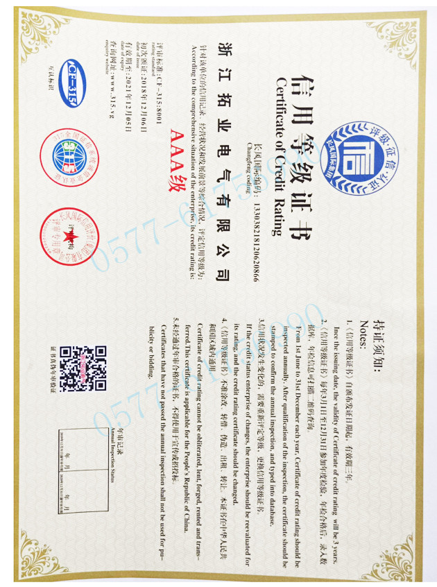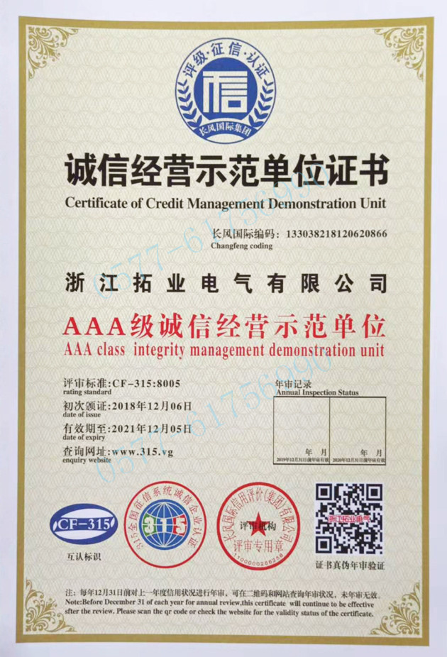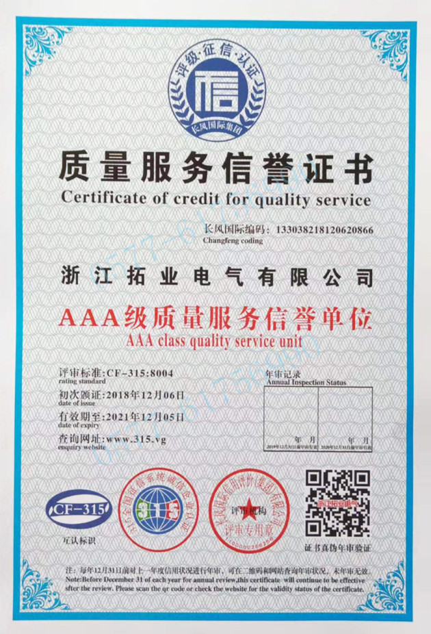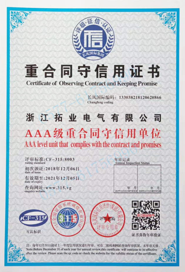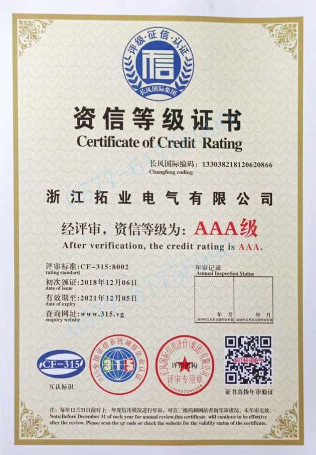拓業(yè)電氣公司技術(shù)力量雄厚,工裝設(shè)備先進,并已獲得多項體系和產(chǎn)品強制體系及檢測認證,公司以"精細化、嚴謹化、專業(yè)化、智能化"等創(chuàng)新工藝為標桿,以"專業(yè)-精益"之推進,立足浙江、面向全國和走向世界,為致力于打造智能電網(wǎng)設(shè)備優(yōu)秀品牌而不懈努力和奮斗。